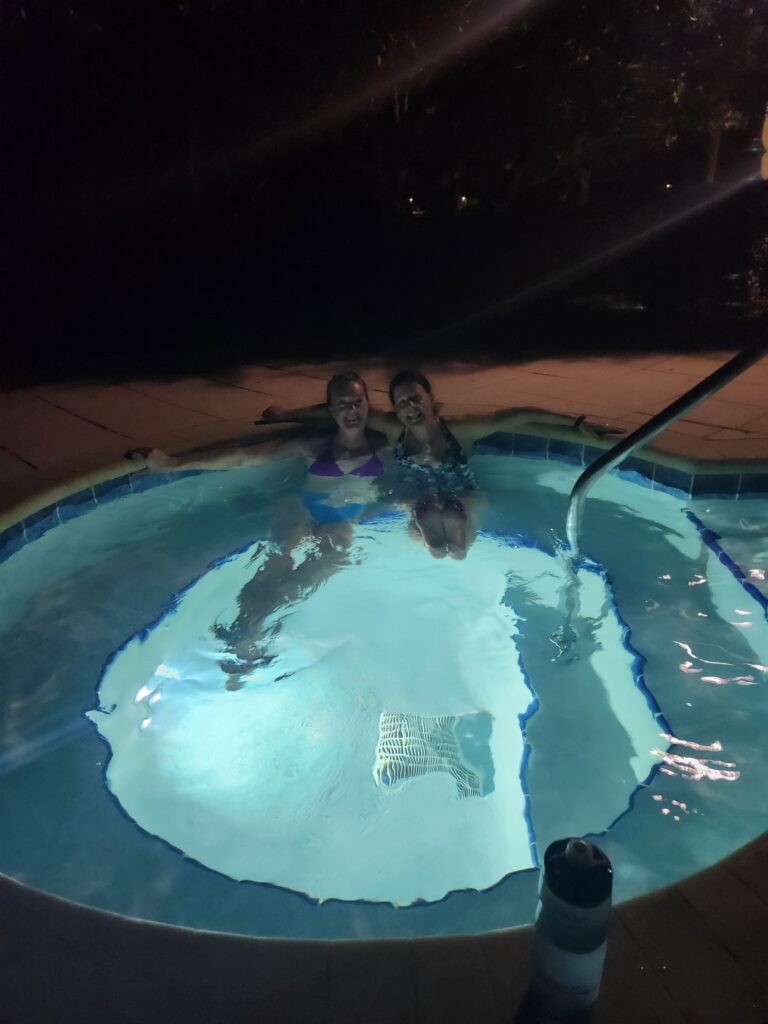 The weather deteriorates a bit but still comfortable. Around 9 pm the three of us decide to sneak back into the hot tub like last night. Says closed of course but nothing stops us again so we go in and enjoy the hot tub in solitude. We hear and Liz sees someone at the gates so we hide a bit and keep quiet for 10 minutes until they are gone. Ha! We’re so clever.