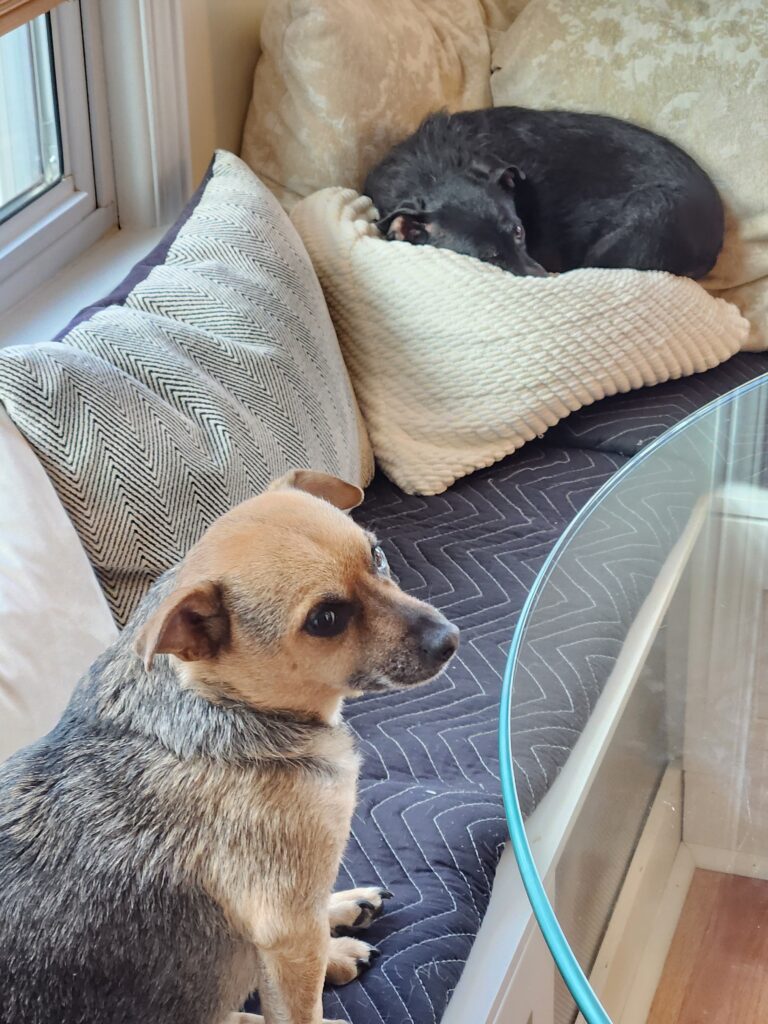 Mel makes us a nice light breakfast while Sherpa loads the car and we entertain the two cute dogs.