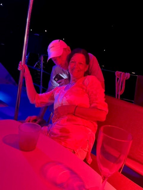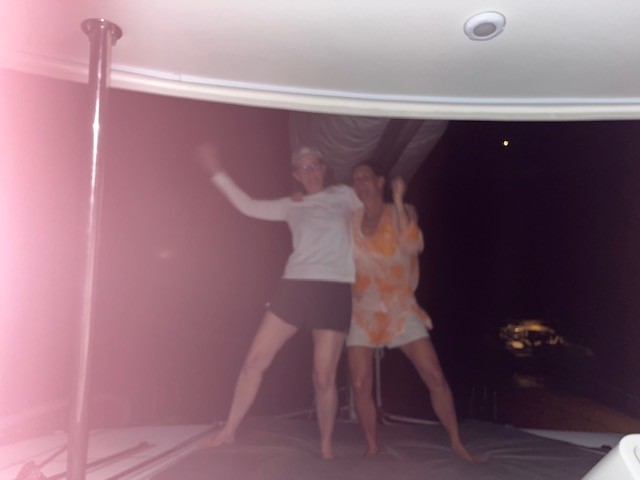 We have a couple drinks, I play bean bag toss with Laura tho neither of us know the rules. Time to go, the girls invite the other boat over after dinner, the oblige and we end up having a bit of a bender dance party under a full moon.