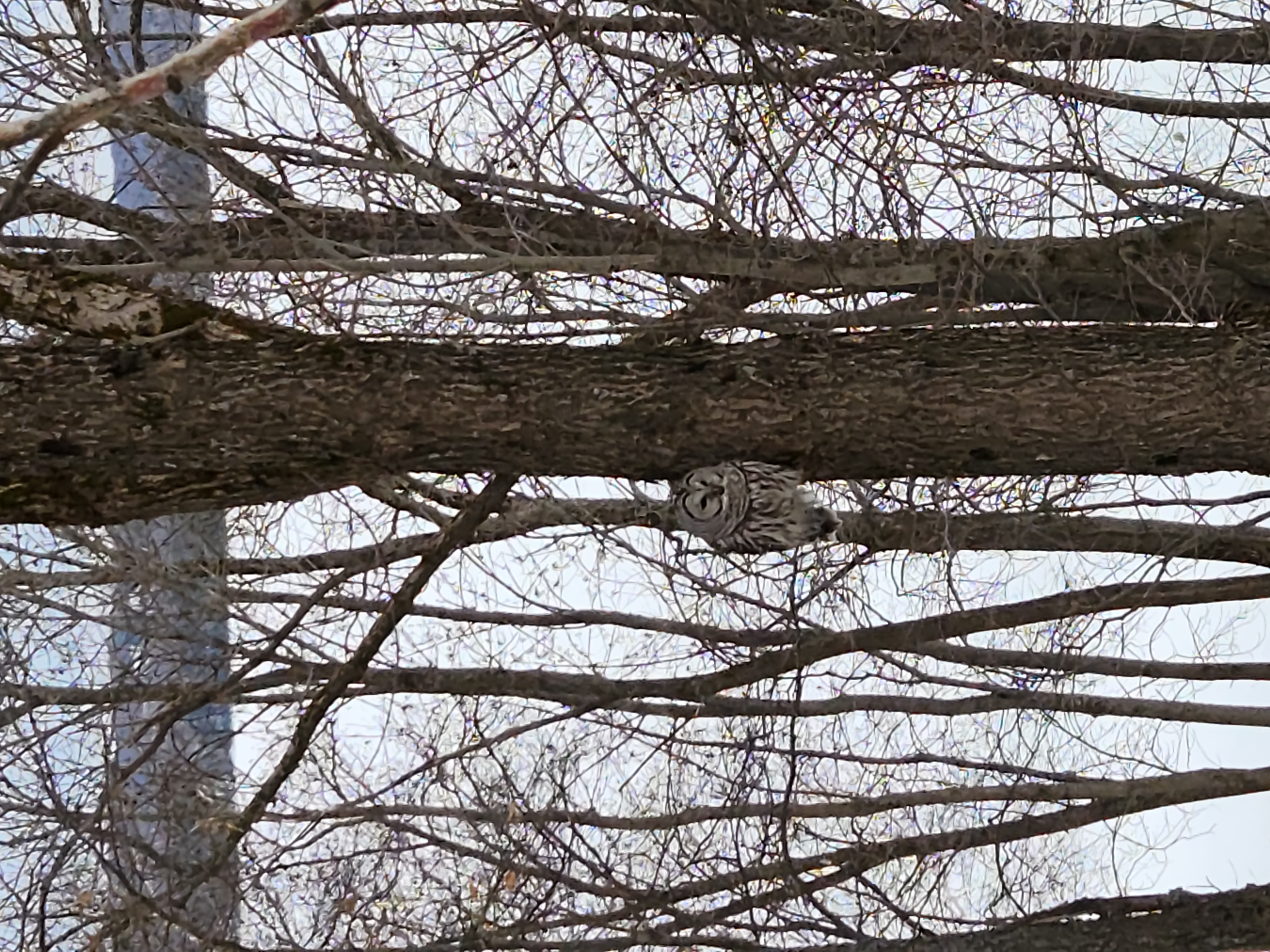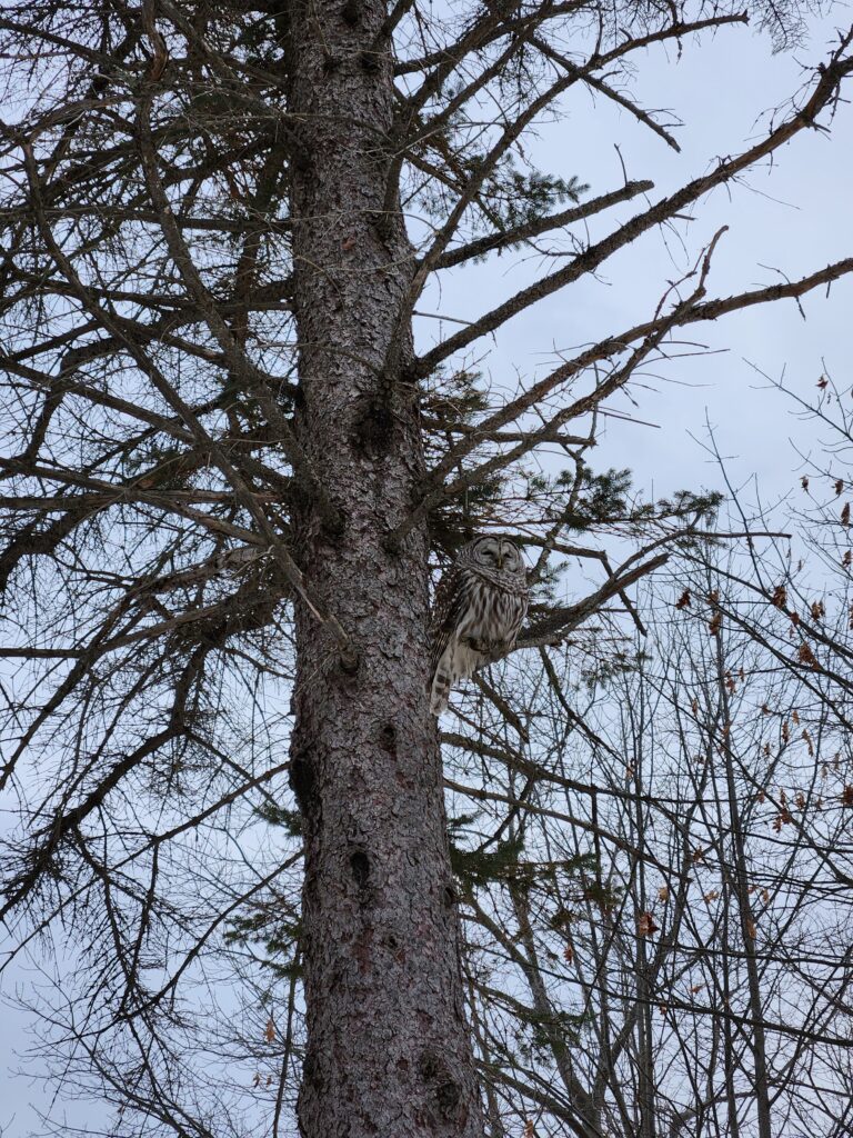 Then one afternoon, 5ish, day I’m looking at the trees behind the cabana, checking for likely firewood candidates. I see a bump on a tree. What the heck is that? OMG it’s an owl! He/she is looking at me pretty nonchalantly, I take a pic and he flies away (amazing wingspan). Rats, I missed it. Nope – she just flies into the big black spruce in front of the cottage. Sits there for about 20 minutes – I call Christy and we both walk up within 10 or 12 feet and all he does is look at us.