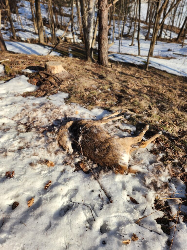 No signs of violence or predator tracks – I suspect he died of natural causes or perhaps was poisoned. I roped up her legs and dragged her onto the ice.