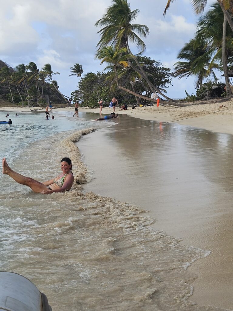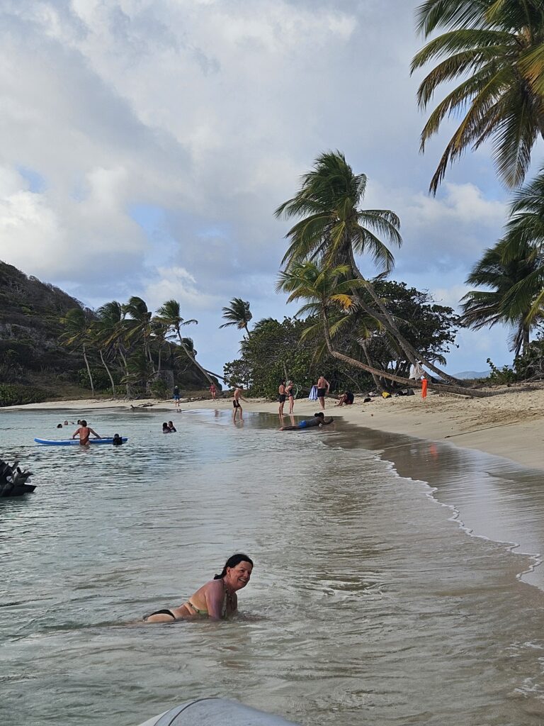 We pull into Salt Whistle Bay (C wanted to go to Saline Bay but I talk her out of it). It’s not too crowded but a bit challenging to find a good anchor spot among the many cats at moorings. First you have to shake off the ubiquitous thieves trying to sell you a mooring/giving you anchoring advise for a fee/trying to get you to go to their restaurant/selling you fish, ice, etc.