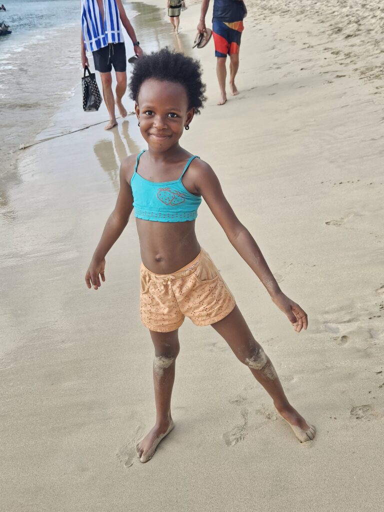 We go ashore, have a nice walk among the old hotel ruins, along the windward beach, back along the beach. There is Eric who invites us to dinner at Donna’s. Sold. First Christy goes for a swim in the shallows while I tease a local little cutie named Omala.