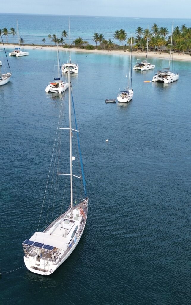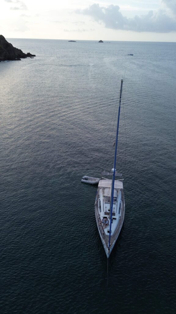 Back on the boat the wind is calm so I try the drone (see attached) while Christy has a shower and locks herself in. Luckily she is right below me where I’m flying the drone so I land the drone and rescue her.