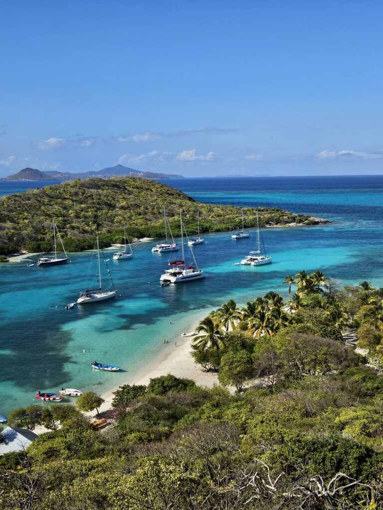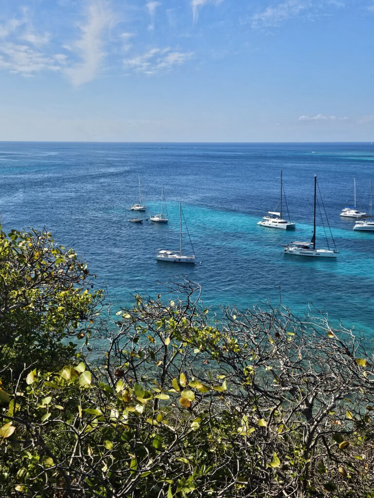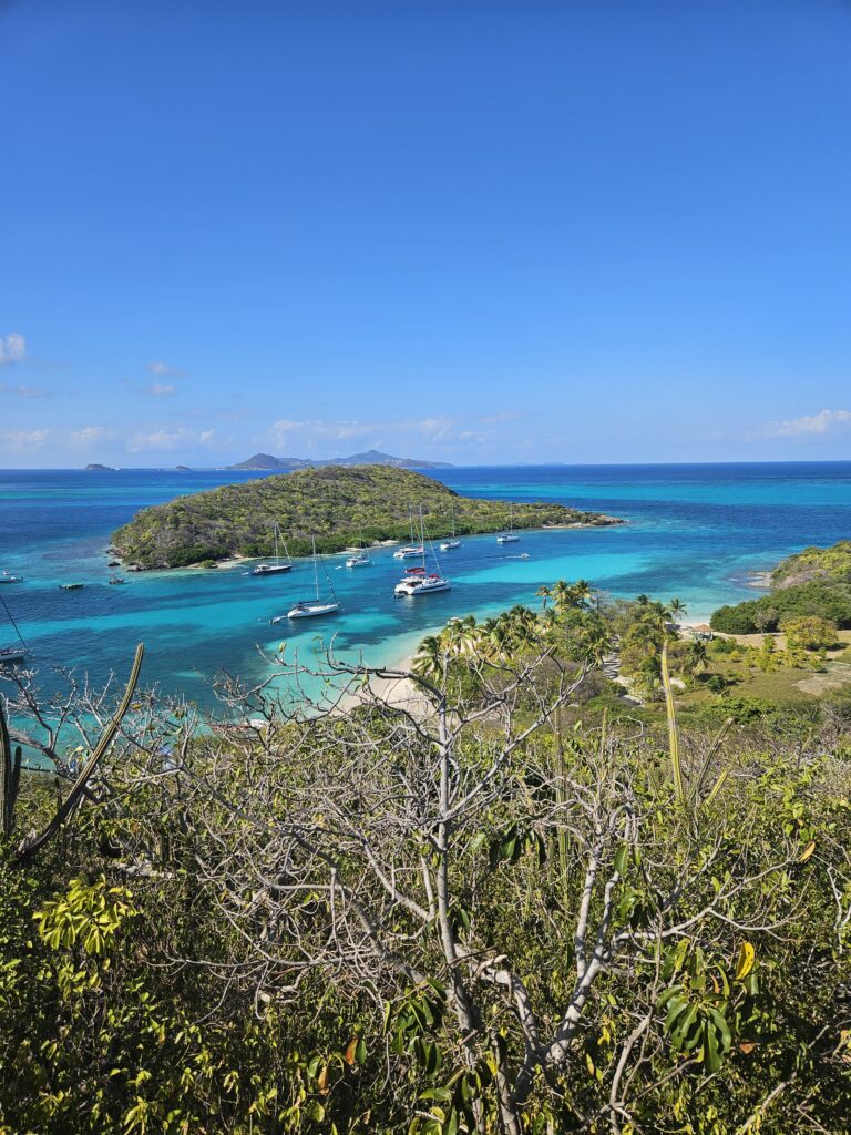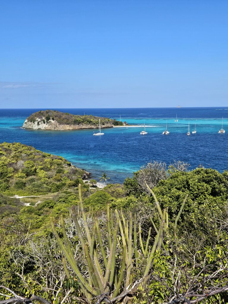 We fritter away the morning then decide to go ashore for a hike up the big hill behind Petite Bateau, the small island where we will have BBQ lobster on the beach tonight. It’s a rough landing and Christy has hurt her toe some more so she is not up to the scramble up the hill. Off I go alone.