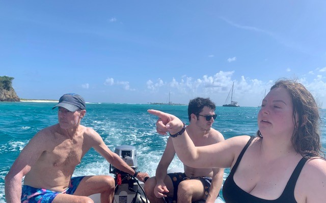 I drive the dinghy all over Tyrell Bay trying to find our guy, turns out he is at the marina so I find him and take him out to the boat. He fixes the motor pretty quickly, we buy him a beer and then take him back to shore. He recommends a restaurant for us and that’s where we go.