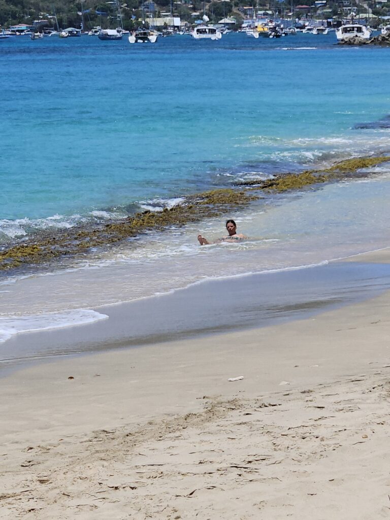 We find a shady spot on the beach by Da Reef bar, have Christy’s sandwiches and relax. Christy goes for a swim (I’m not feeling it) and then does her exercises in a shallow pool on the beach.