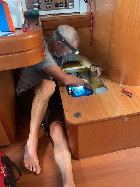 Well, jobs to do of course. First thing is install the new MPPT controller. Easy-peasy, right? Well of course, no job is easy on a boat – every space you have to go is cramped in the best case, inaccessible mostly. The new controller is too big for the backboard holding the old controller so I have to McGiver it to attach to the wall above the old 220V inverter. This is temporary, I’ll have to move it in the fall when I have a drill and the new inverter. Cables are too short, gotta squeeze every millimeter out of the cords to connect.