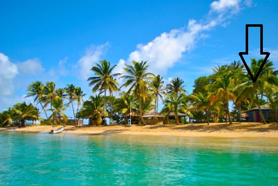 Abandoned resort in Saltwhistle Bay. Arrow points to where the maintenance buildings are. Fascinating place, for sale apparently – US$6-10 million.