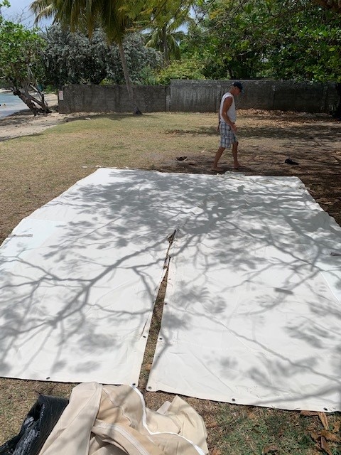 Today is Sunday so no retail action for us. We wanted to go to Church but no way I can walk there, even though that’s part of the reason we came to Prickly – it’s probably only a km away. We decide to try to figure out what this big tarp thing is for so we drag it and a few other mystery tarps over to the grassy area by the beach. We still don’t know what it is for although we do know how the strapping would attach to it. We think we’ll use it to get a sunshade made for the back of the boat. Generally we are happy with our shade situation except as the sun gets low in the west. Then it blares in the back of the boat and roasts you. We don’t have good sitting areas up front so the best thing is a vertical sunblocker hung off the dinghy davits that we can roll up and down.