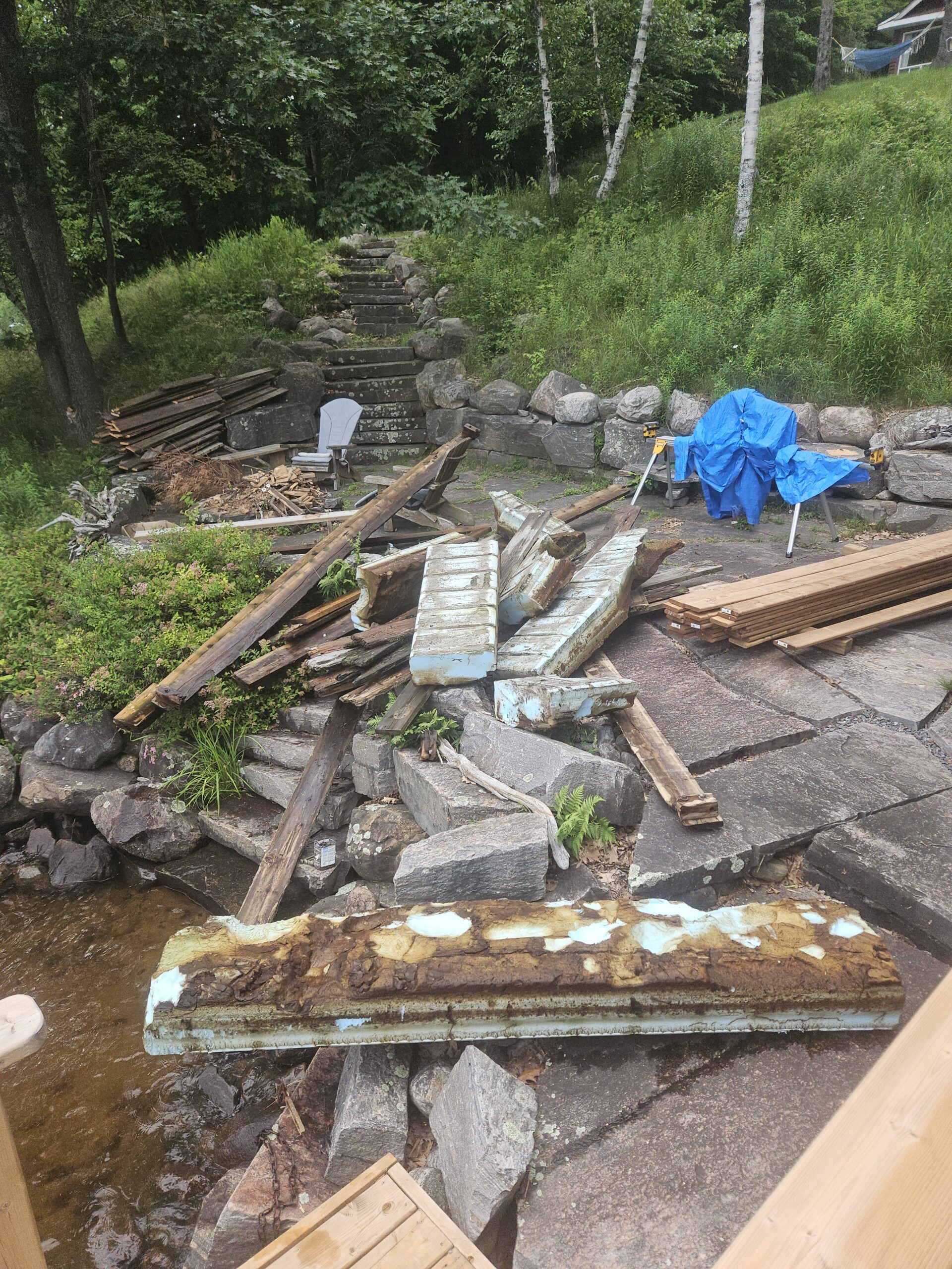 Early cottage projects included replacing the upper deck on the cabana, building new walkways to the shed, Cindy and the new dock we bought (see video below). Buried a water line from the greenhouse to the cottage so we don’t have a garden hose running across the lawn and driveway all summer. Finally got the Generlink installed for the generator backup and ran electrical to the shed, Cindy and the pump box which I moved.