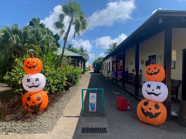 So we dinghy back to La Phare Bleu where I get gas now that I have two-stoke oil. I put gas in our one-gallon and Bob’s large dinghy tank. Today is Hallowe’en and there’s a bunch of families here and LPB is ramping up for an evening party. Mostly for kids but we make a dinner reservation anyway.
