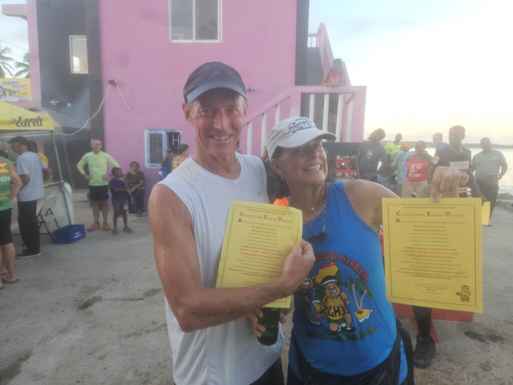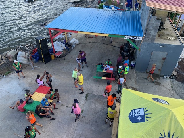 Abby is on time to the minute and we ride in his van (it’s a bus on regular days) with John, John, Tim and Chris – all sailors staying in Prickly Bay. The run is in Grenville which is almost an hour away. We have no idea what to expect but turns out we’re about an hour early. So we stand around in the absolutely blaring disco music and chat with people. There’s a couple faces we know including James from Horizon so we’re meeting people. We buy a couple singlet shirts and sign is as “Virgins”. There are runners, walkers and virgins. We’re told virgins get a free beer at the end. Cool.