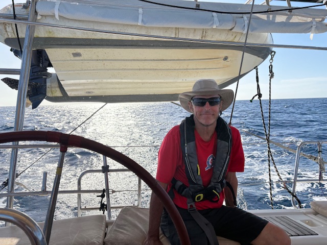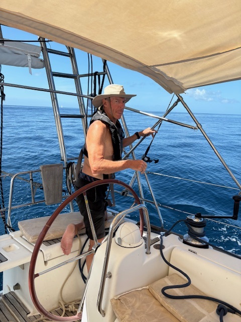 We decide to try fishing so I throw out the rod and a lure. About an hour out of Carriacou I notice the rod bent and all the line unrolled – guess I didn’t hear the drag going. Christy and I take turns wrestling the catch back to the boat. Feels large.