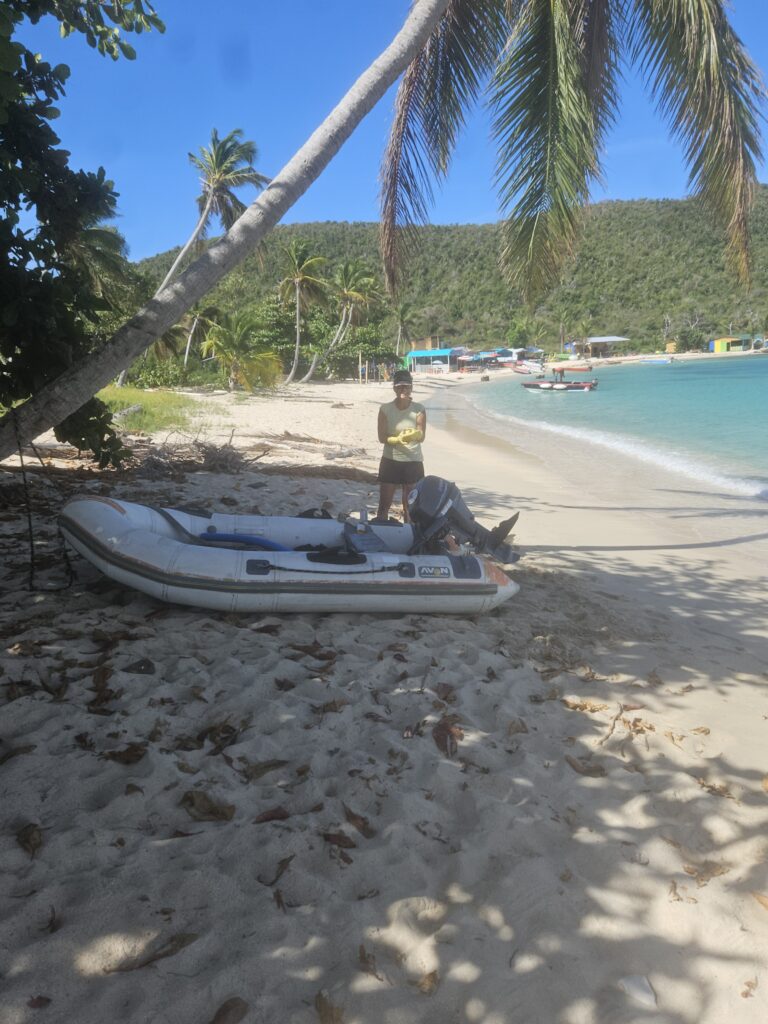 After breakfast we dinghy over to the beach, find a bit of shade and begin the process. We clean the dinghy and bumper with MKE and scrape as much as we can. Then I start gluing the gaps on one side and eventually the disconnected bumper with this super glue while Christy paints.