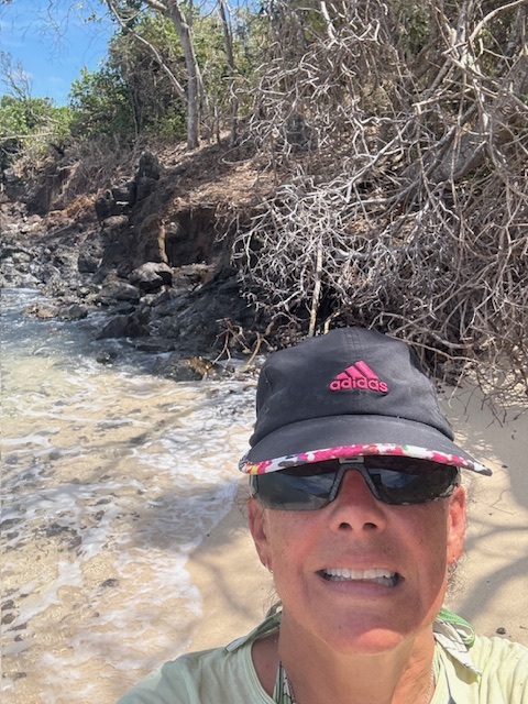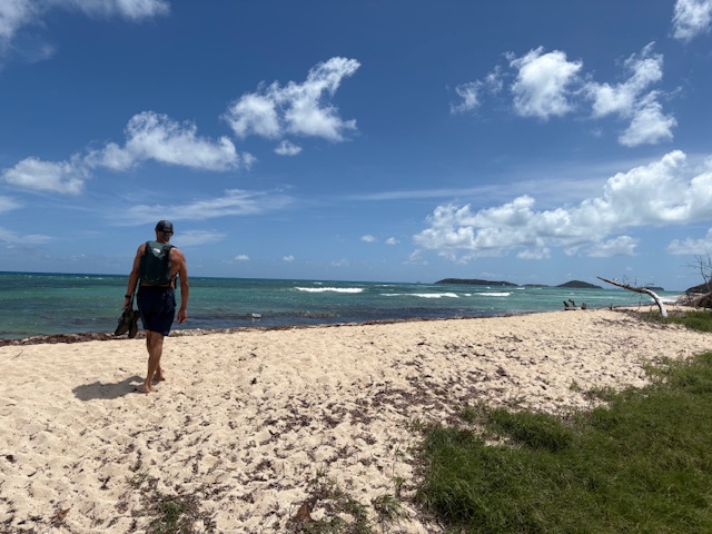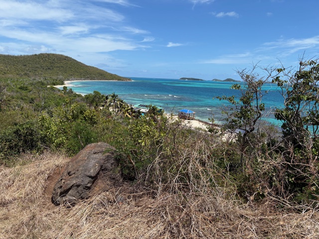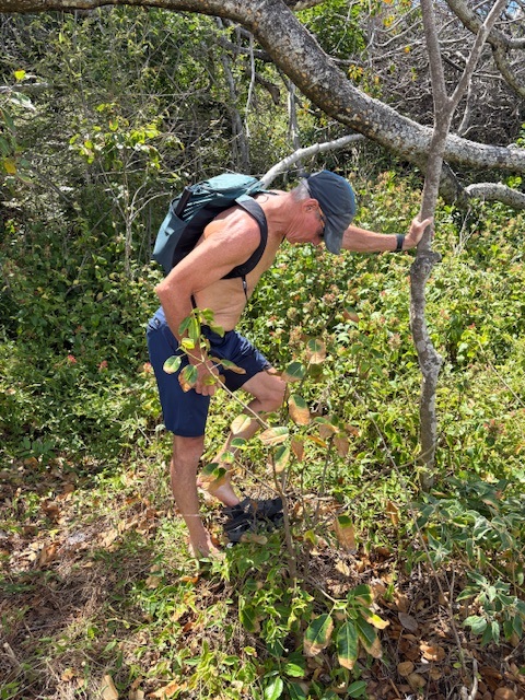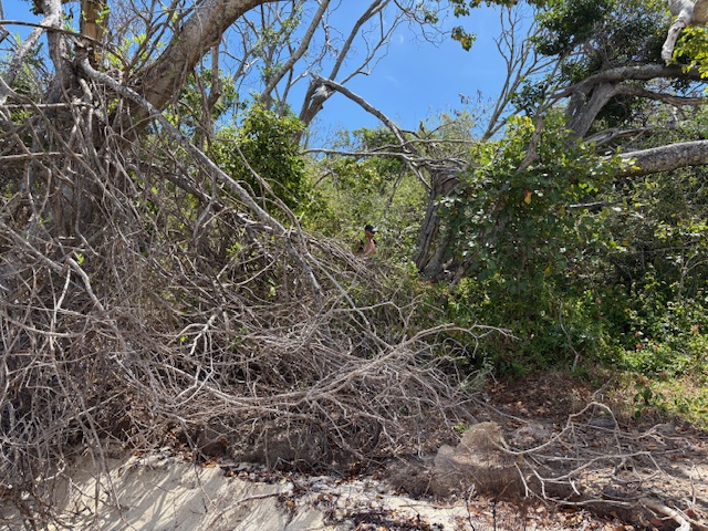 We walk to the end of the windward beach by Saltwhistle Bay but after about a half hour of getting scratched to pieces we give up trying to find the path. The whole area is blown down but I never would have guessed we wouldn’t be able to find the path. Monroe, owner of The Ranch tells us later there is no way to get through from either end and he is going to have to clear it with a chainsaw. Hopefully next time.