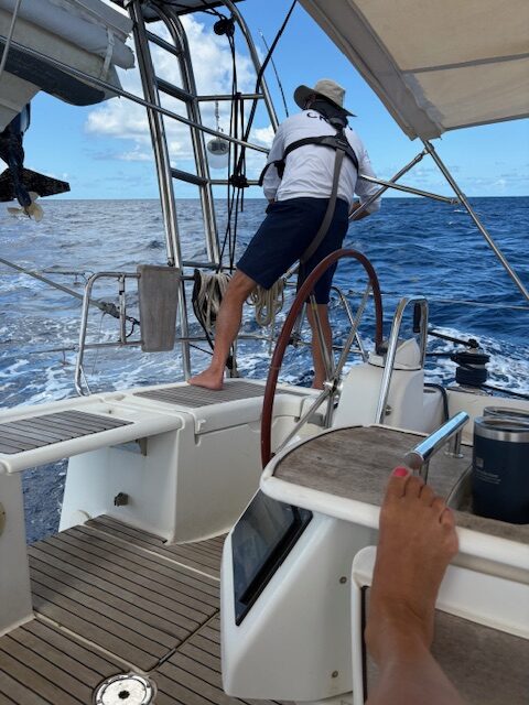 We’re up early as we have a pretty long sail to Bequia today. We leave by 8 am and the sail should take us about five hours or so. We notice beside us as we depart the Cays that the boat, Africots, the folks we met in Mayreau at SWB and then again at the Cays Lobster feast, are just ahead of us sailing out. We follow them out through the reefs outside of the Cays. He’s a very experienced captain and his cutter, a rig with an extra sail (a stay sail) upfront, can sail quite well going upwind. We also have a stay sail that we can put up (with much effort so we don’t this time) and it would’ve helped us with our speed as we see Africots zoom ahead and start making quite a gap between us… they are fast, so fast Perry thinks they have the motor on lol!