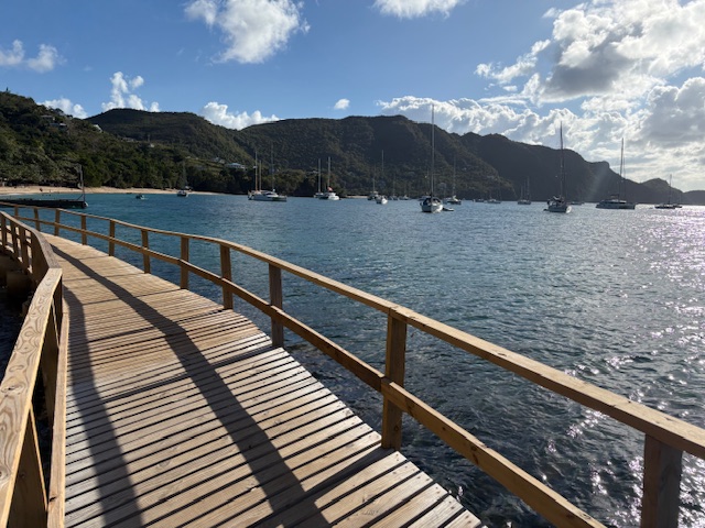 Once settled on anchor, we set off for a little walk into town and to Plantation for their Happy Hour! It’s a lovely walk on the boardwalk and we check to see if we can find Marj, Kaaren’s friend we met in Grenada, who is supposed to be renting a little yellow cottage on the boardwalk during this time. We walk by a yellow cottage but no sign of any life. We’ll check again tomorrow. We head back to the Plantation, our favourite lux resort with a fantastic Happy Hour, however once we get there we find out that they only run it Tuesdays and Thursdays now… so we will come back tomorrow!