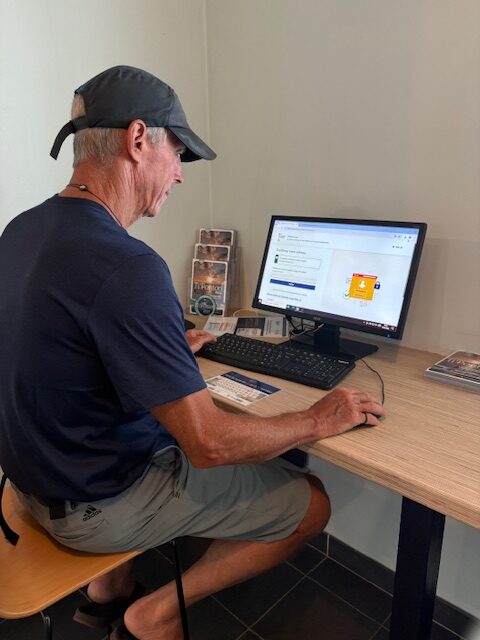 There’s a great dinghy dock and after stumbling around the mall and butchering French with the tourist office, we find Customs and Immigration. Here we go again: gotta use their app, gotta use my email, gotta verify by email, except I have no email since we don’t have any Internet. We are able to steal the mall wifi thanks to the kind ladies managing the crazy bureaucracy and eventually log in. Fill out the forms, but botch the submission. Takes another half hour to get it right as there are people coming and going using the 3 computers.