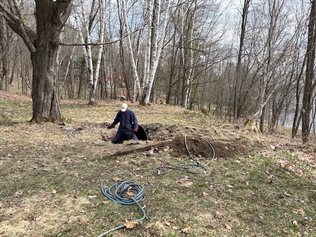 The job that needed fixing most of all was the septic system. I had hoped that the outfall was just frozen when we left for Milu in February and probably it was, but no amount of thaw or snaking seems to clear it. The upstairs sink doesn’t drain and the downstairs bathroom is out-of-order.