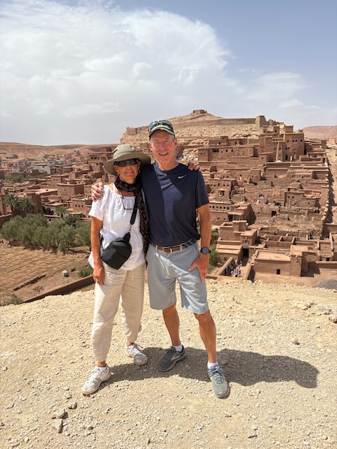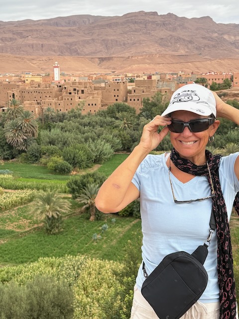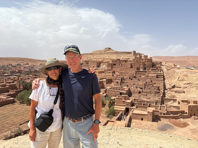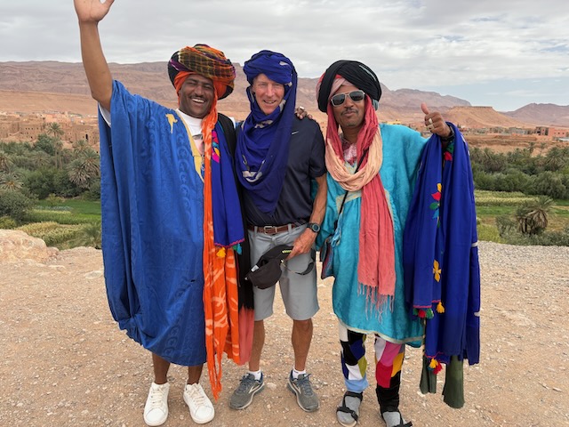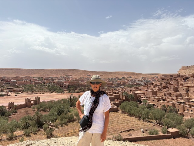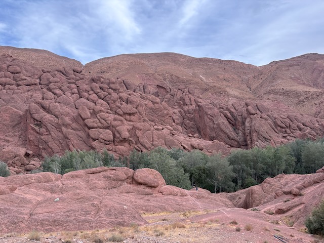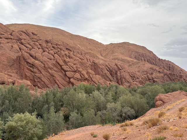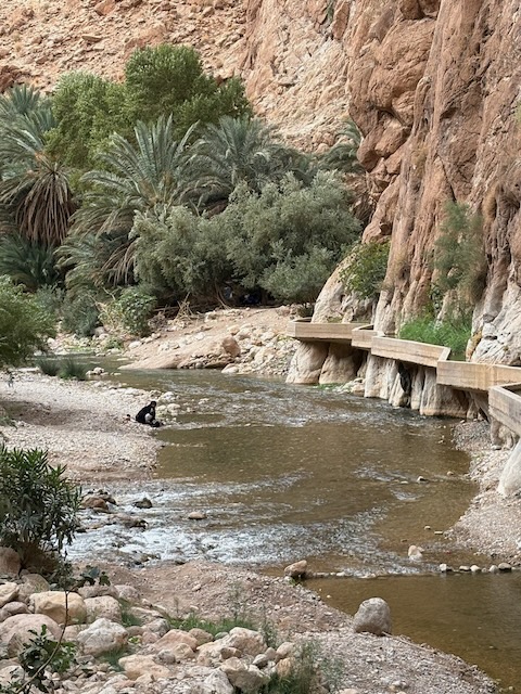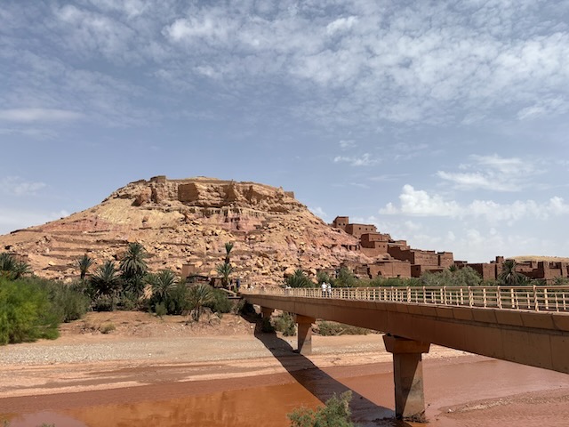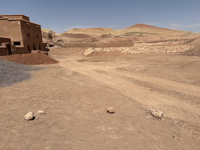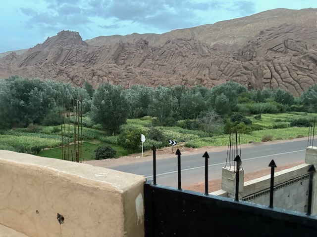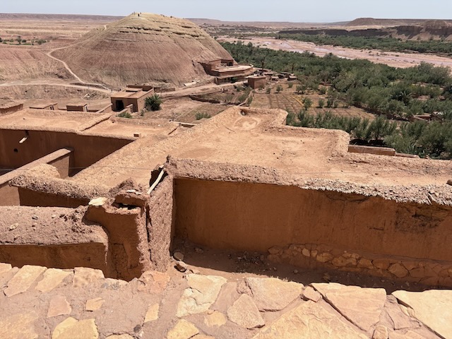 The countryside is amazing, tho stark in some places where it is very dry. Stoney plain often, then lush valleys full of orchard where there is water. First major stop is the very touristy Ait Ben Haddou which means fortress of the sons of Haddou. Fin told me about and I ordered the book “Lords of the Atlas” which describes the history here. It has been a major film location for dozens of movies from “The Man who Would be King” to “Game of Thrones”. Atlas Studios is a major studio theatre about 40 km from here. Today Ben Haddou is thronged with tourists. It’s pretty interesting and we’re fairly glad to have a guide but it’s a serious tourist trap.