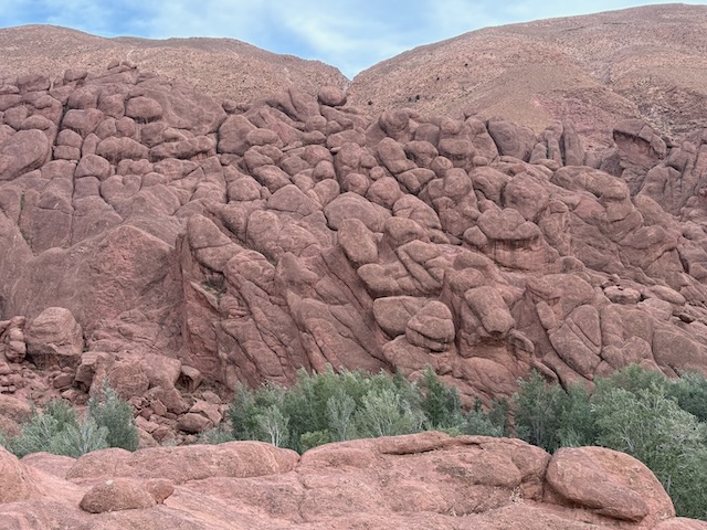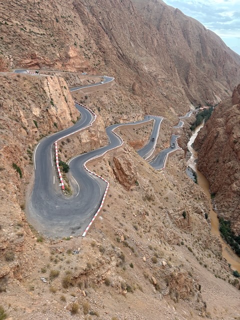 The Dades gorge is truly spectacular, we stop a few times for pics. Abdu takes us to the top of the canyon for some spectacular shots before returning us to our quaint hotel at the bottom. The trip to the top is scary in a car even though the road is good. Big busses can’t make it up these switchbacks because they’re too tight.