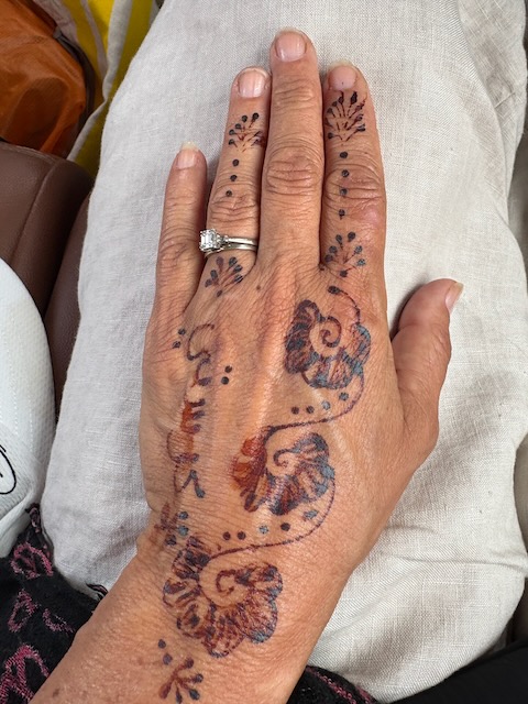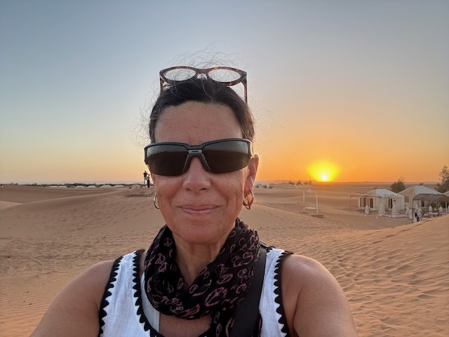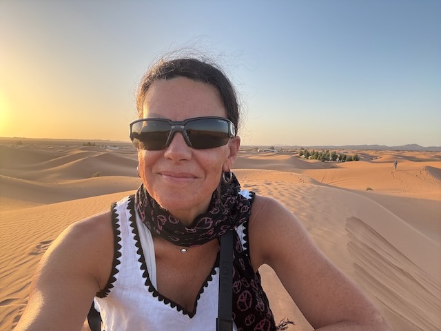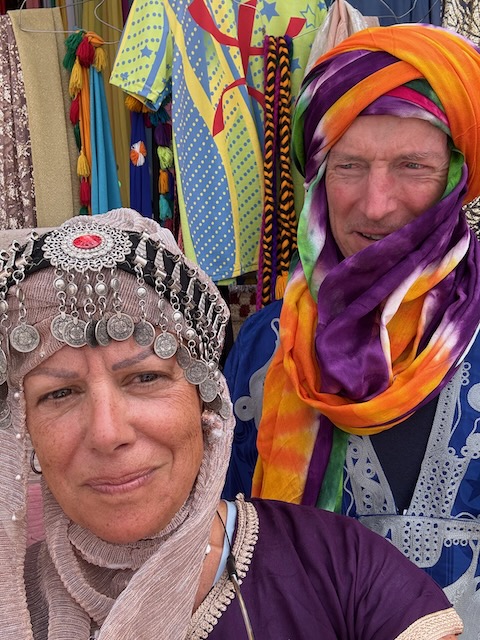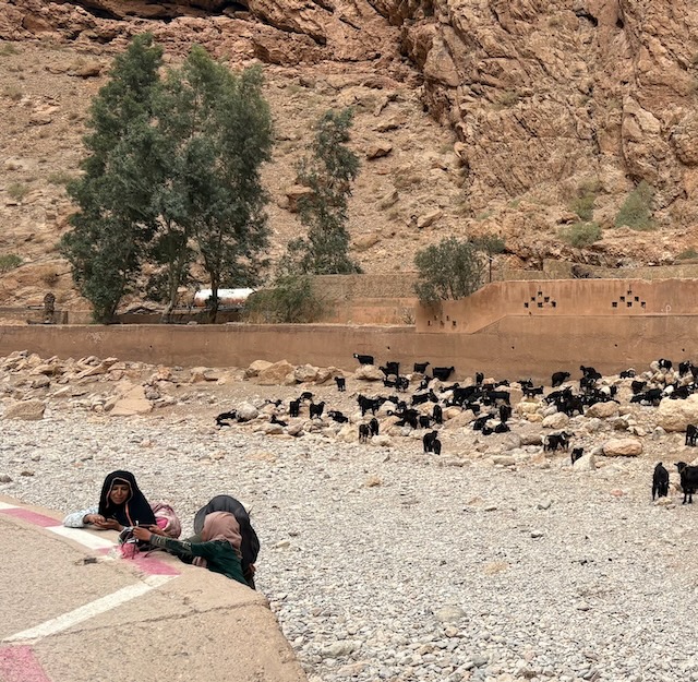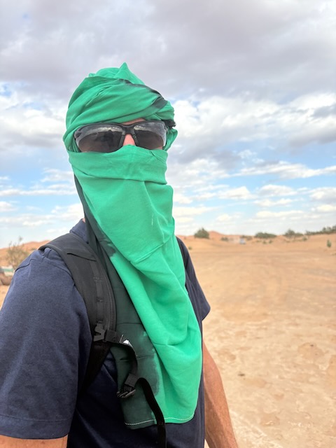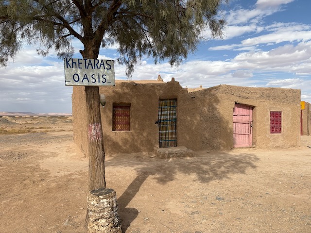 Both Christy and I are nodding off occasionally in the car because of the heat and the sameness of the landscape here. Flat and stoney, until you come upon a gorge with dramatic sides and lush bottom. We stop in a pretty arid town to buy wrap-around scarves. Abdu has been telling us not to buy them at other spots because they are too expensive but they are necessary as the Sahara is windy. At this joint they are expensive and cheeeeeaaaaap – unravelling as we put them on. Muna is not impressed and returns at least one that is frayed badly from the get-go. I have my doubts about the necessity of the scarves and certainly about the quality here. I’m 99% sure we’re here because of the deal Abdu has with the owners. I don’t know if we just happened to have calm conditions in the desert in a few hours but they certainly weren’t a necessity.