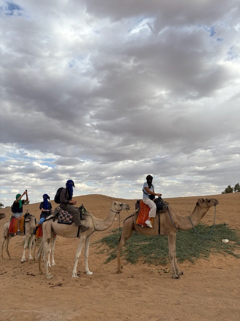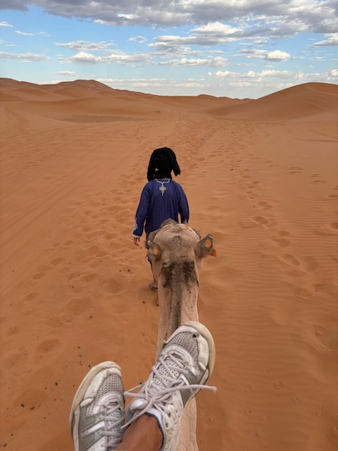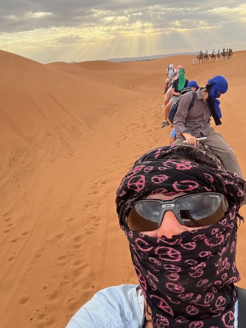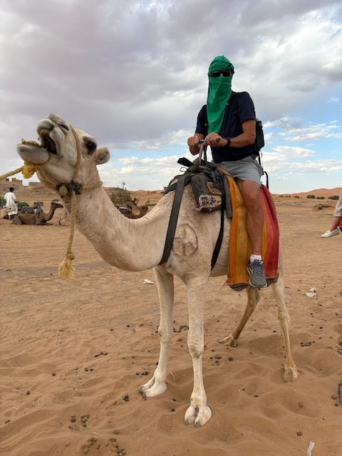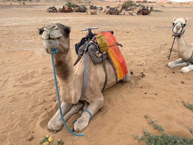 Another hour or so puts us at the drop off point for our camel ride across the Merzouga dunes to the edge of the Sahara. Abdu was talking about a hotel drop off and a swim (!) but instead we are rushed out as the camels are ready. They will take our gear in a truck to the tent city near the Algerian border.