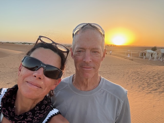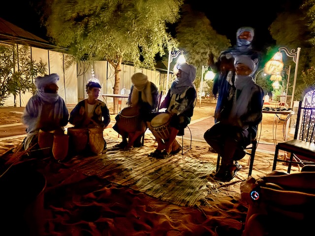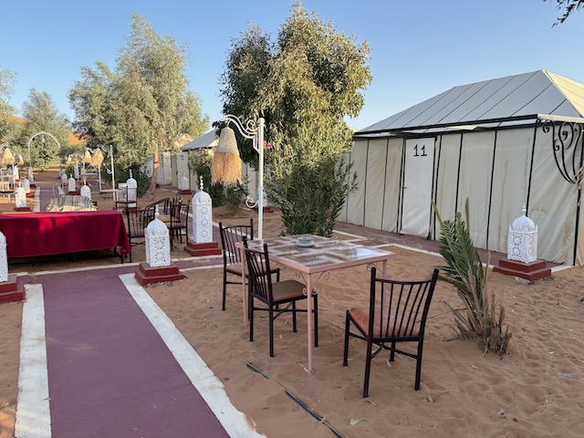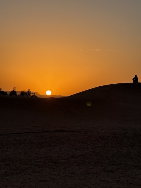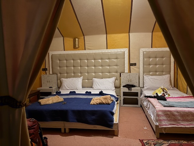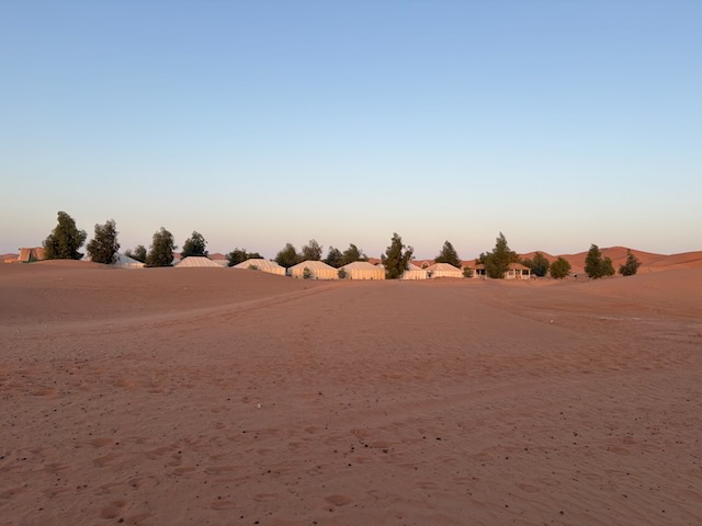 We ride for about 90 minutes including a stop for some pics atop a reasonably high dune. All glad to dismount, we retire to our pretty luxurious “tents” complete with tiled floors and bathrooms. The only thing missing are power outlets for our tired electronics and fans. The rooms are very hot, even an open window doesn’t help much.