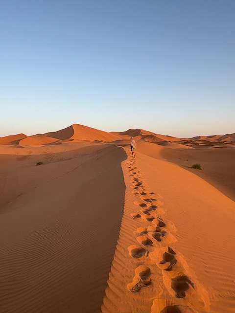 We’re headed for the Merzouga dunes now but before we get there Abdu stops at this very lonely outpost. Not much going on there, he says it’s closed but we get out and take a look around. The sign says Khettaras Oasis and there are rows going off into the distance of these open mine things, look a bit like small craters from a distance. Back in the car I google it and turns out Khettaras is a fascinating way to get water from the mountains into these arid areas by digging underground waterways. Check it out here.