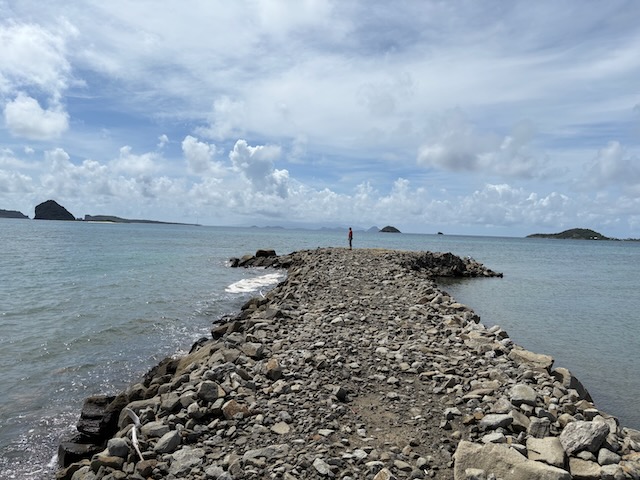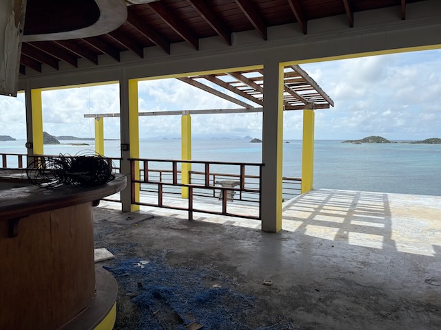 So instead we head up the hill behind Carriacou Marine and onto the windward side of the island. It’s a nice walk around the completely empty beach, tho we have to thread our way thru some mangroves near the end. That exits near this imposing looking, hurricane-obliterated hotel. Turns out to be the former Cassada Bay Resort Hotel, a fairly high-end spot that is now almost completely destroyed. It is very sad.