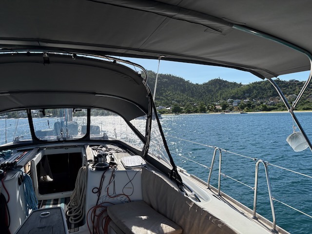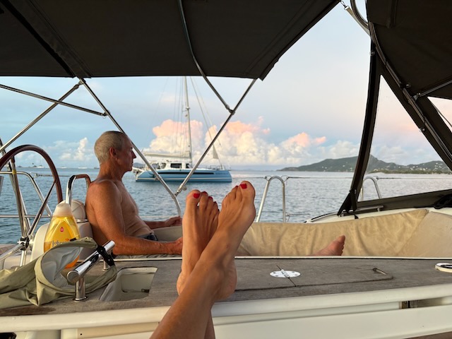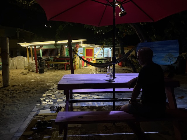 Later, we swim to shore and walk the beach. There is a band playing at the far end (it’s Sunday doncha know), they sound pretty good. We walk around, see how far we can get at the north end of the beach. There used to be a road here that took you around the airport to Hillsborough but gone now. On the way we are greeted by a spearfish diver who chats us up. Turns out he is camping on the beach, permanently, and trying to make a living farming sea moss. Tough life but he is doing it, living in tents and under tarps, catching rainwater and operating on solar.