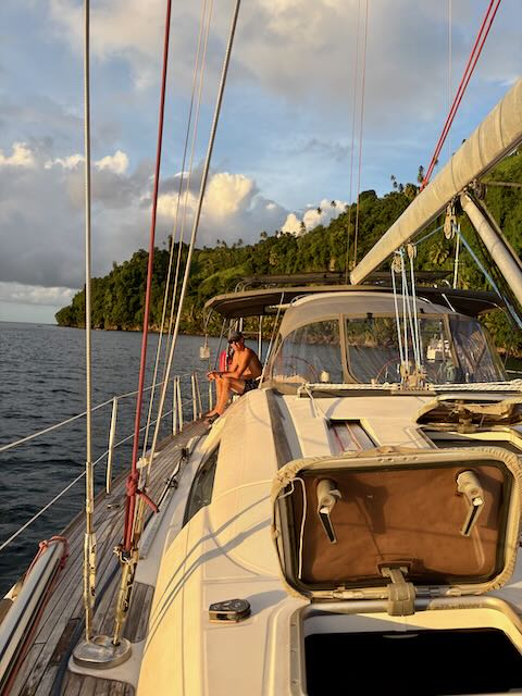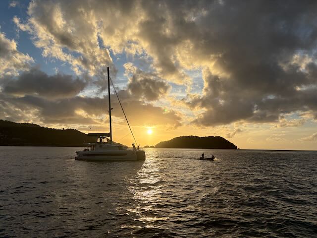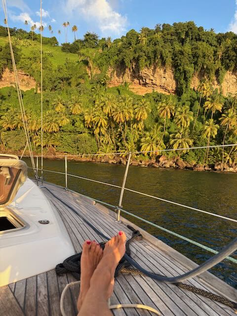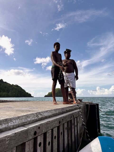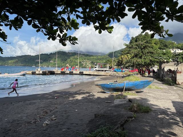 Arrive in Chateaubelair around 2 pm where we are met by Kemroy’s relative Julian who helps us anchor. We won’t need a guide next time, we now know where to anchor in this bay. Of course we are accosted by a few vendors including Kemroy’s uncle, all are looking for handouts. Julian is supposed to take us to customs (he’s in a rowboat) but Kemroy is on Whatsapp with Christy and tells us to go there immediately, they are waiting, they saw us come in.