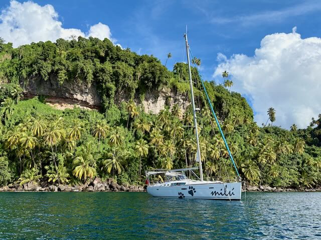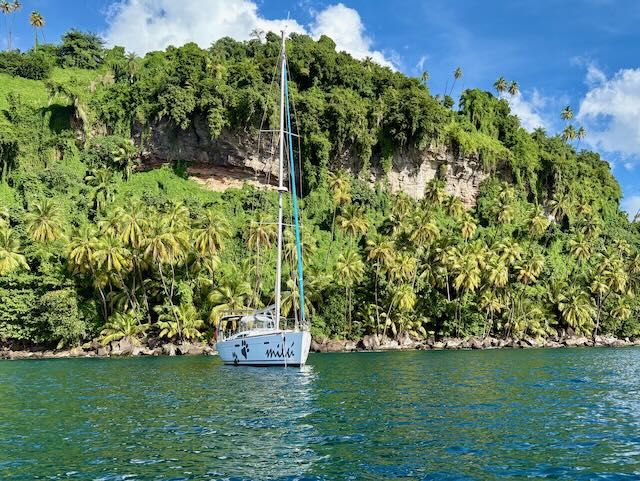 Chateaubelair is quite beautiful from a scenery standpoint. I get the drone out to take some video of the impressive cliffs behind our anchorage and the bay itself. It starts to rain and gets very windy before I can fly it. Chateaubelair Island apparently has great snorkeling and diving and even the snorkeling right off the back of Milu is supposed to be very good.