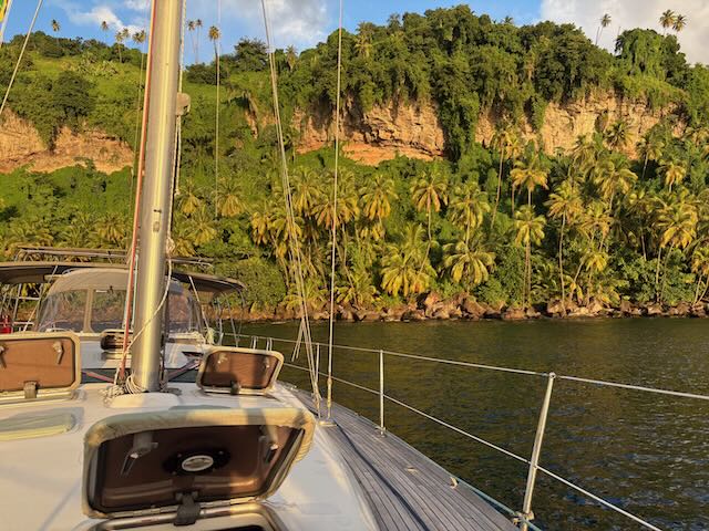 We’re off early, by 9 am to cross Bequia Channel and sail to Chateaubelair on the northwest coast of SVG. We intend to sail close to the island after crossing the channel to (a) see the scenery and (b) find out if the winds are better close to shore.