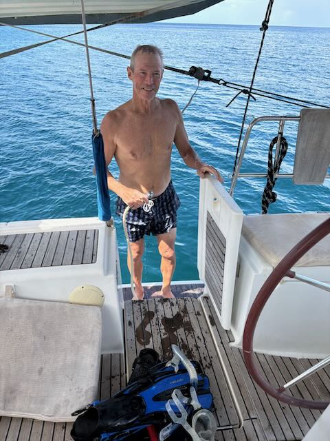 We snorkel up the north side then onto the beach to look around, then snorkel up the south side and back to Milu. Getting back on Milu, Christy and I are talking about the flippers we bought that I can’t wear because they cut the tops of my feet every time. She says “there must be a way to fix them”. I take a closer look and sure enough there is a hard plastic insert that is only there for the sales display! Should be taken out for use. Duh.