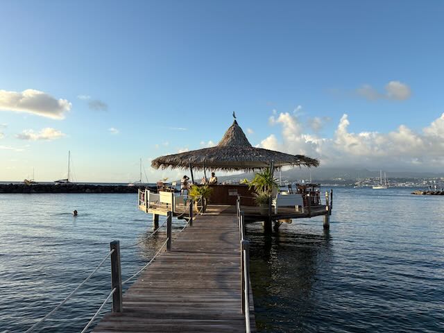We tour around the marina a bit and wander over towards Pointe du Bout. There is an interesting resort there, but we can’t walk around it to the beach so have to backtrack. Back in creole village we are generally looking for some place to eat but nothing opens til at least 6 pm, some of them 7 pm and it is only just after 5 pm now. We walk back towards the beach area and find Kano, a recommended creole bar/restaurant. Nothing really creole about it that I can see but the waitress is fun and we have a few laughs as we try to communicate in our Frenglish. Christy has steak kebabs, very good, I have lamb chops, healthy portion but quite fatty and a bit tough. Pepper sauce is great.