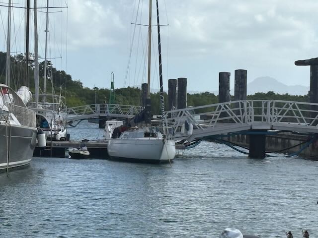 Only injury is Christy cut her hand a bit on the barnacled mooring line.