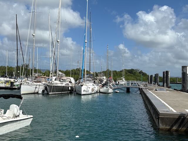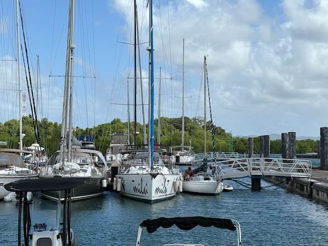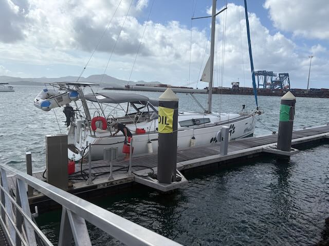 As we get close I try to radio the marina but the motor is too loud and I can’t hear what they are saying. When we are entering I radio, we are loud and clear, they are expecting us, I say we are going to get gas first and they say OK, see you at the gas dock. This all in Frenglish.