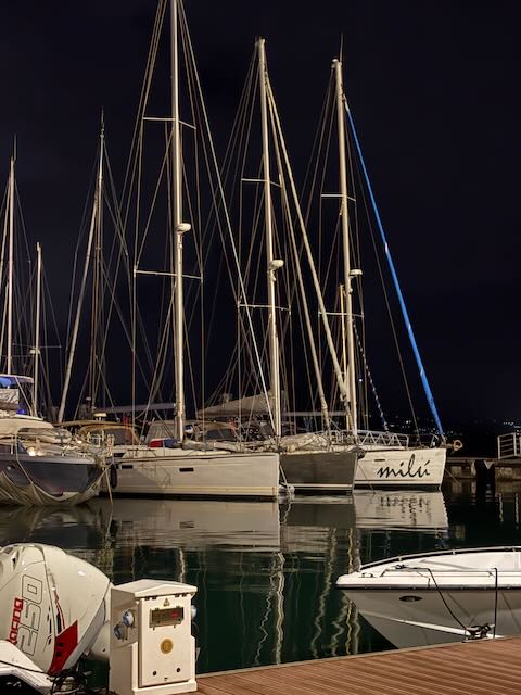 Gregory is manning the whole show today and he asks if we need help landing the boat at B1-02, our assigned slot. “Oui, SVP”. Turns out the slip is VERY narrow, being tucked between a large Jenneau and a tiny sailboat. We have to back up all the way down the channel because 02 is the first slip, somehow make the turn in reverse around the Jenneau without smashing into the little guy.