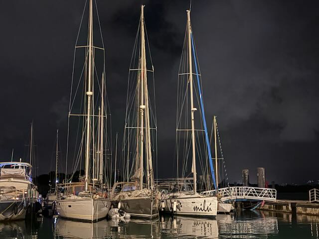 Turn right into the channel, then back up all the way down the other channel. Milu is actually stearing quite well in reverse, though I am going as slow as possible. I make the turn in slowly, there are about 4 guys around the dock, including two in the tiny boat next to us. They hold us off as the wind pushes us a bit wide. Gregory and “other guy” take our aft ropes and secure us, Gregory hands Christy the forward line which she uses to pull up the sunken mooring line (so that’s how they do it), I go forward and tighten it. We’re in.