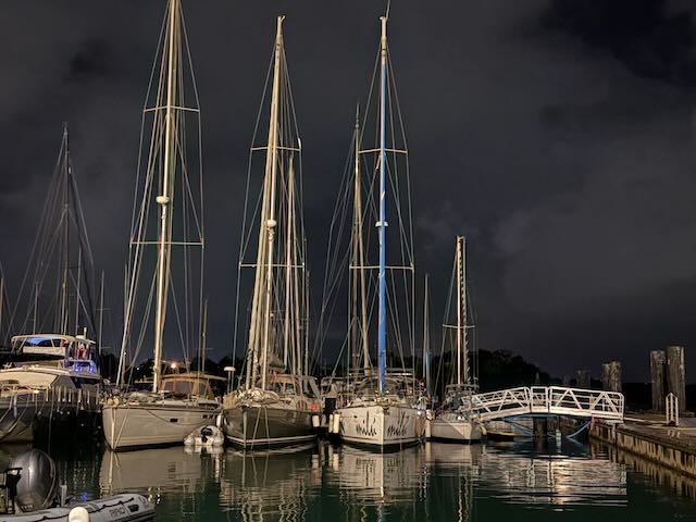 We see the gas dock no problem but while it was fairly calm inside the marina, by the gas dock it is blowing 20 kts. Thankfully there are 3 guys onshore, we have bumpers and lines ready and soon enough we’re secure to the dock. We wait for the boat behind us to clear, then back up to get gas.