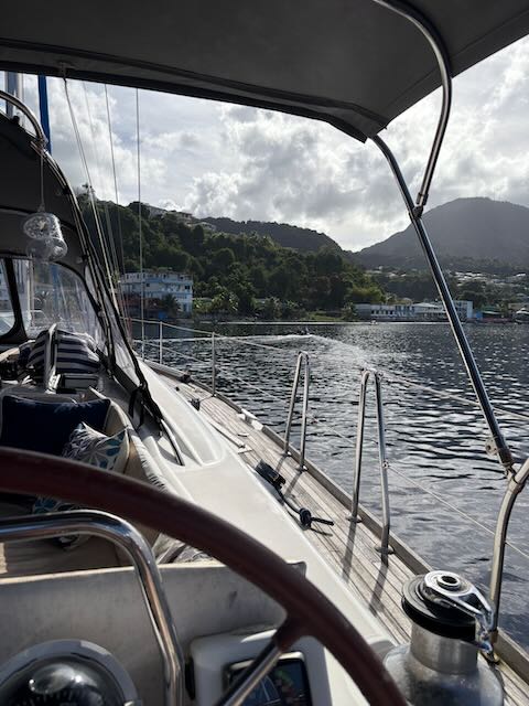 We gather our stuff and go to find customs in town. It’s hard enough to find a place to park the dinghy but the guys at the ferry terminal tell us to pull up where the fishermen do. It’s very slippery and pretty tenuous but the dinghy is safe and no one has an accident. We wander around until we find the Customs house in the back of the ferry terminal. That was a challenge. Couple of young Germans there the gang chats with as I clear into Dominica. The Customs officer is super nice, offers all kinds of ideas about what to do in Dominica.
