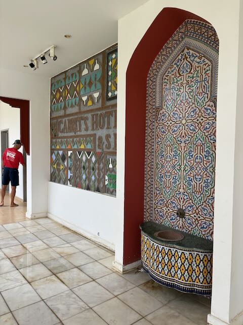 While we’re ashore and since it has stopped raining Christy and I wander towards the Cabrits park and peninsula. At the end of the beach is the massive, defunct Cabrits Hotel and Spa. It’s huge, seems to be well built but completely abandoned. We learn later what a fiasco this was – it was constructed around 2012 or so, nearly completed in 2015 but never opened. There are still notices online where the Dominican government is desperately looking for someone to operate it. It was built by the Moroccan government – we suspected as much as the styles of Morocco are all over it, including the restaurant which they call Medina. This was clearly a giant money-laundering scheme.