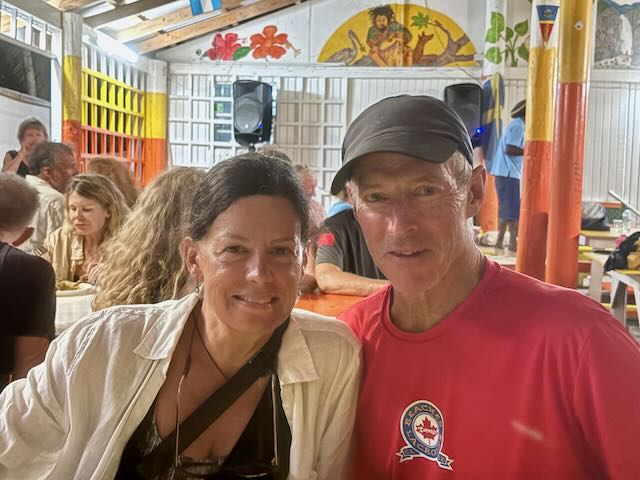 Around 6:30 pm we dinghy into PAYS and get settled in for the BBQ. It starts out very quiet but pretty soon the place is hopping. The unlimited rum punch starts flowing at 7 pm, I’m drinking the virgin variety. We’re sitting at a table with 2 Americans – Mike and Scott and a Swedish family of 3 – parents and their adult son.
