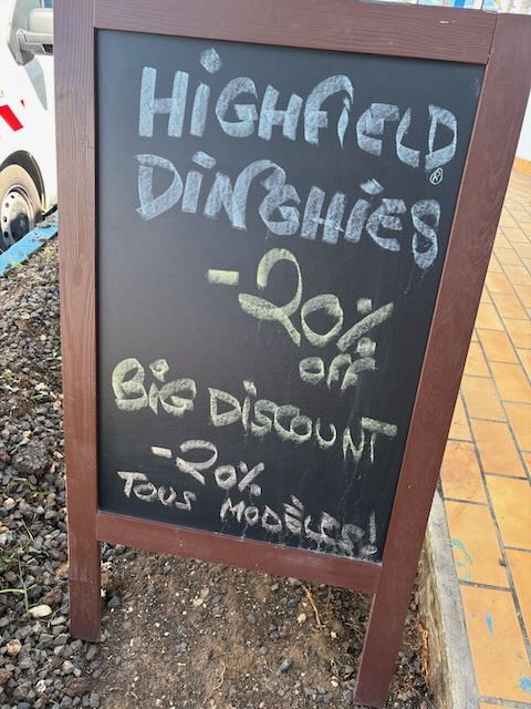 Captain Nautic chandlery is having a big sale on their Highfield Ultralight Dinghy’s. While I’m picking up some gear, Christy is asking how much. Matthew, a guy we will come to know a bit says EU$3020. That’s an amazing price, about C$700 cheaper than the duty free price in St. Maarten. Birthday present for Christy and Perry? We don’t commit but get the price in writing and leave.