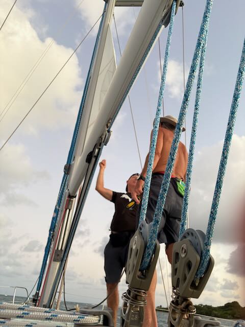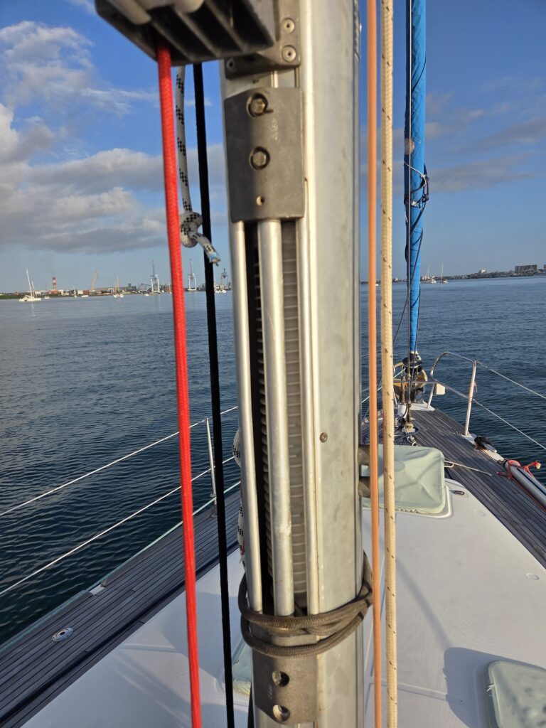 On board I start poking around with the furling mechanism again. As I am working a dinghy pulls up. I go to see who it is, it is a French Canadian named Michel who has come to look at our rigging. He just had his similar boat re-rigged and they told him his old stays were too tight. He pulls on mine and suggests they might be too. Pretty soon he’s helping me with the furler – we think if can get the old rope out, we can put the new one in and maybe it would be OK. But need to unfurl the sail and it is not cooperating, plus it is too windy.