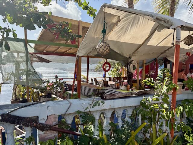 We walk back around the bay to the northwest, eventually turning around as we pass most of the interesting places. On the way back we stop at a quaint little seaside restaurant that seems quite popular. That’s a good sign. We get a very nice table on the ocean and get two excellent meals – jerk pork for me, bbq chicken for Christy. Chat with the waiter a bit and watch the huge carp come around in the shallows for the restaurant’s leftovers they toss in the ocean.