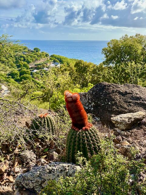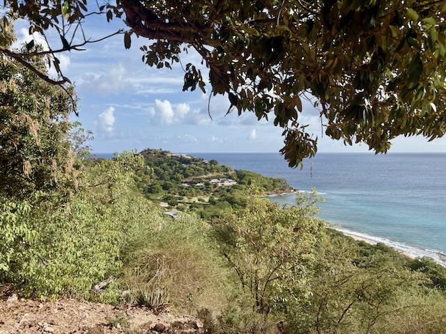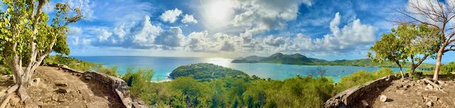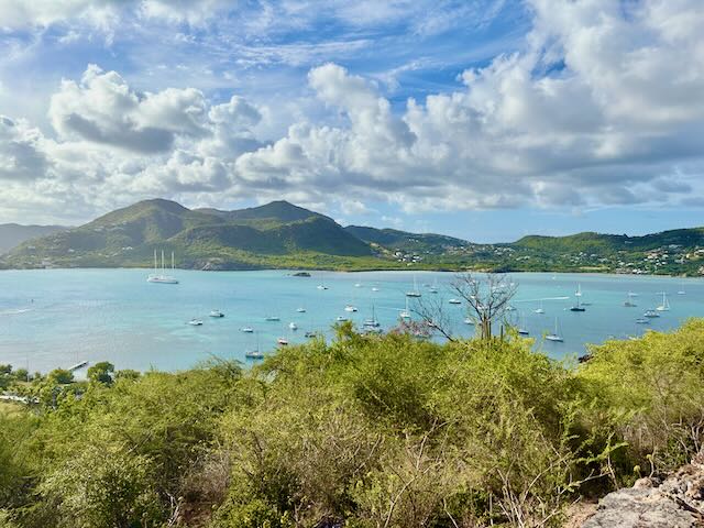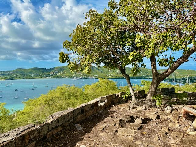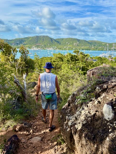 Around 3 pm Christy and I go to the dinghy dock and explore the walk from Pigeon Beach across to Fort Berkeley. We don’t get too far as not much time. There is an old battery atop the first rise but nothing there except the old stone “patio” where the cannons used to be. We walk a bit further – the views are great and the little bay between English and Falmouth Harbours looks divine – if you’re fabulously rich. Nice beach, very private, faces the ocean, fairly sheltered from the prevailing SE winds.