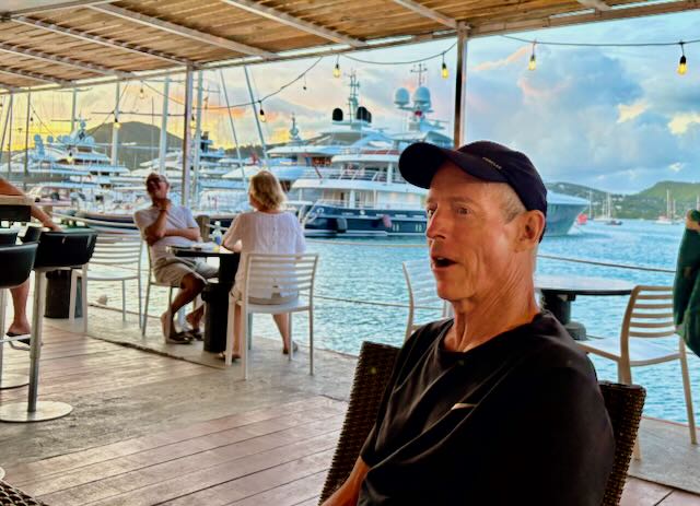We walk maybe halfway then return as we want to go back to Milu before dinner. It’s a pleasant walk. We see young people all over in small groups, we assume they are crews for the racing boats or superyachts here. Clearly 3 guys have just finished work and are headed to Pigeon Beach for a swim.